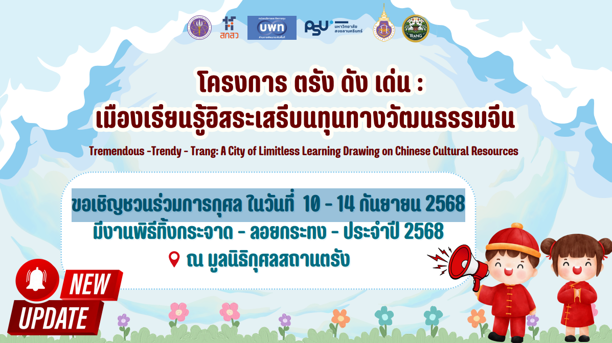 ขอเชิญชวนร่วมการกุศล ในวันที่ 10 – 14 กันยายน 2568 งานพิธีทิ้งกระจาด – ลอยกระทง ประจำปี 2568 ณ มูลนิธิกุศลสถานตรัง